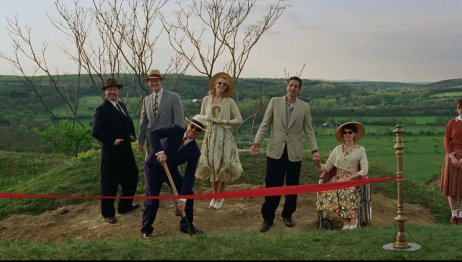 영화는 서곡(Overture)과 중간 휴식시간(Intermission)을 포함한 클래식 대작 소설 구성을 취하고 있습니다. 이는 '정육면체를 직접 만드는 것보다 더 잘 표현할 수는 없다'는 극중 대사처럼, 영화 자체를 하나의 브루탈리스트 건축물로 구현하려는 시도입니다.